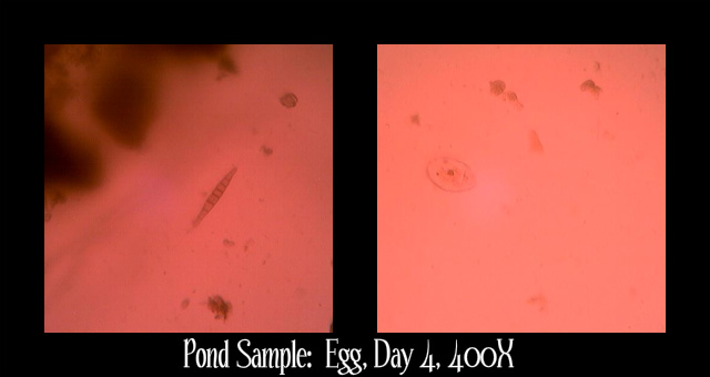 We saw movement in the specimen with the egg and the specimen with the dried grass, but unfortunately couldn’t find anything moving in the other two specimen. (The long strands are fibers from the cotton we used.)