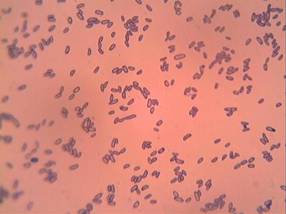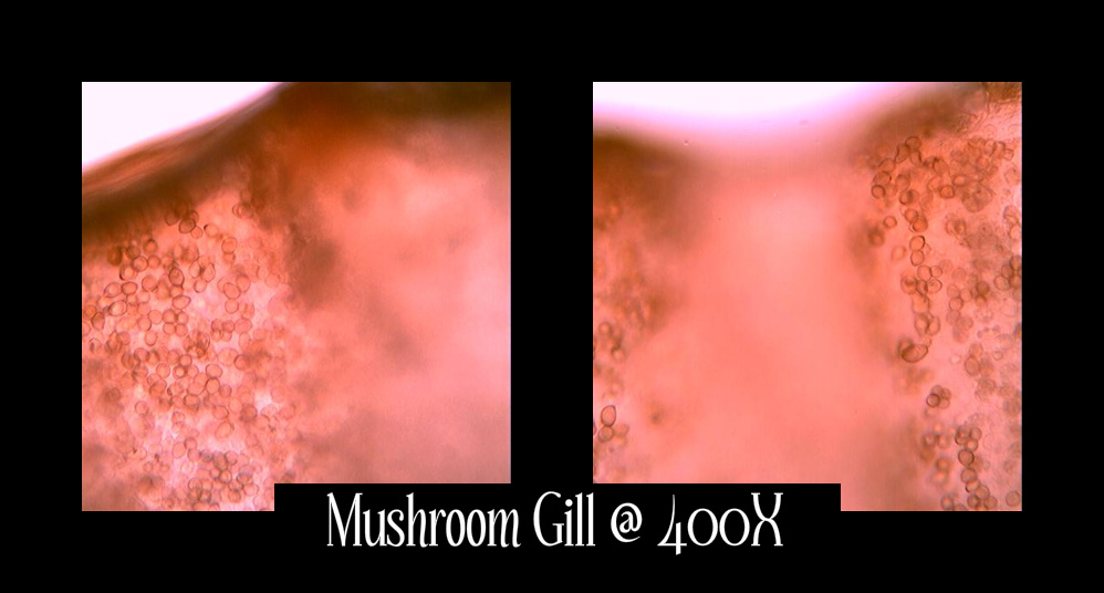 Now back to Experiment 4.1. As we were making our spore print on paper, we made a spore print the same way on a microscope slide. This way we had a lot more spores on the slide than we would have just tapping the cap over a slide. Here are some images:
