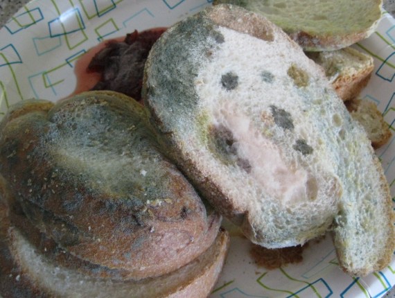 The first bread we tried was name-brand, packaged bread and it didn’t grow any mold, too many preservatives I think. This mold is on bakery-made bread, in the plastic bag it came in. I kept it in the loosely closed in the bag, because we have two cats and a dog…didn’t want anyone getting into it. (Just warm and dry and not in time for class!)