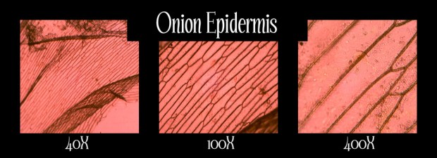 We had a hard time slicing the cork thin enough to really see the individual cells, but after trying again the next day I was able to see the cells more clearly.  The next part of the experiment involves cutting onion, and I for one, was happy no one broke out in tears.  I wrestled a tiny piece of the epidermis unto the slide, added Iodine to stain the cell and here’s what we were able to see: