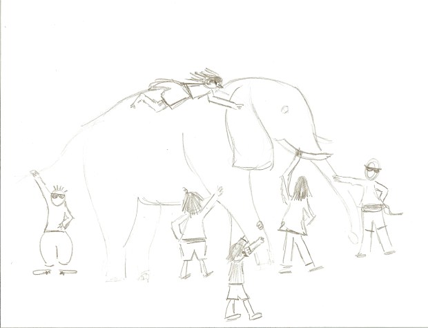 I am enjoying doing the lessons right along with the kids!   To be fair, I’m giving you a rare glimpse of one of my sketches….For this lesson, we had to illustrate a story about six blind guys trying to identify an elephant…