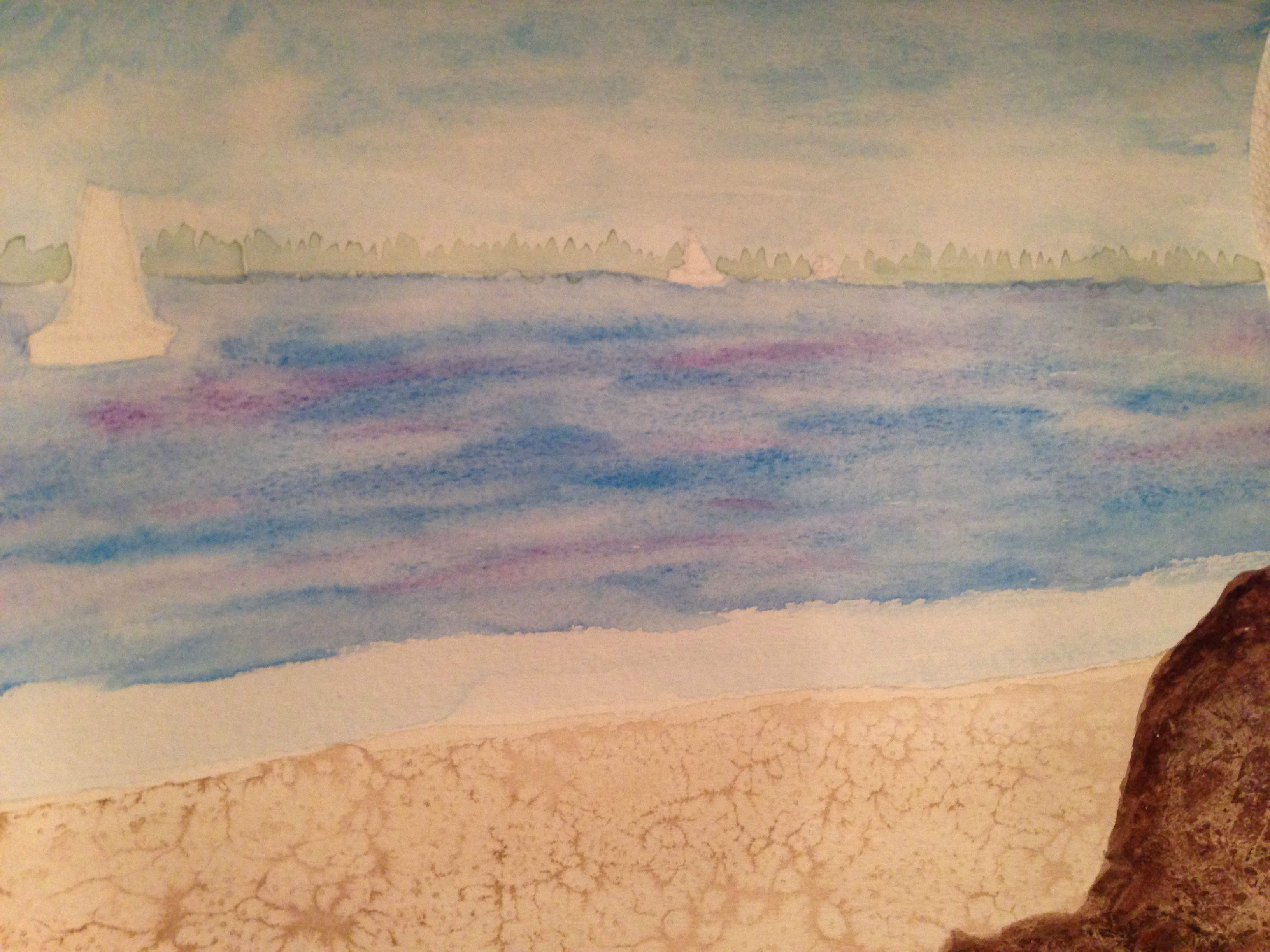We worked on the beach in the foreground and learned two new processes. After doing our wash of the sandy beach, we sprinkled a little salt to change the texture. I thought the results were amazing!