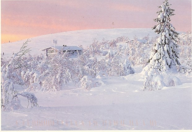 Finland is a country of many lakes…over 187,000 of them! It is pretty flat, with the highest point only about 4,300 feet. That’s up in Lapland, near the country’s border with Norway, pictured in the postcard. The country is largely coniferous tiaga forest and fens. In fact, over 80% of the country is forested!