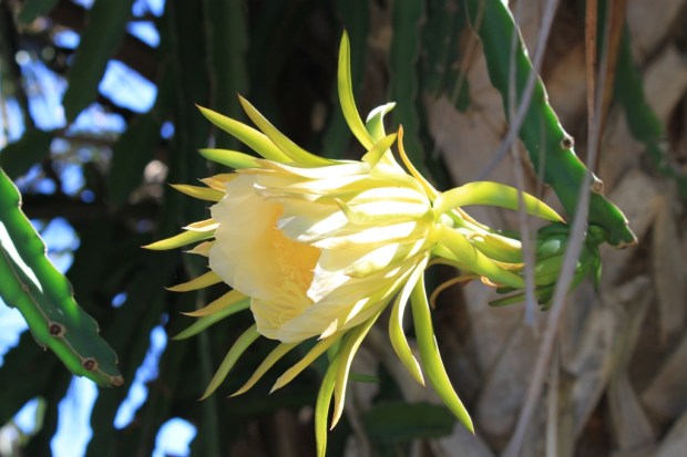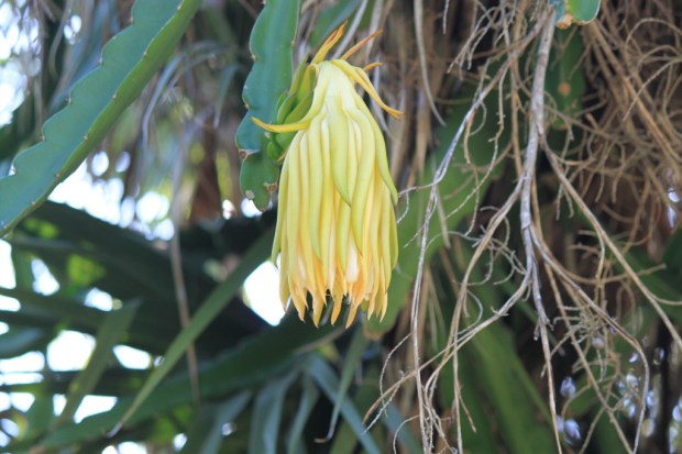 Hanging from a nearby tree, was a vining cactus that was also in bloom. I had never seen this variety before and as I scoured the internet to try and find its identification, I finally located this flower on a website that specializes in cactii. There is no common name listed, but the scientific name is