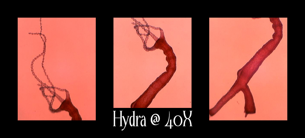 The Hydra is a “typical” member of Phylum Cnidaria. We used the images below and Figure 11.5 (Page 338) to draw and label the as many structures as we could identify. (For a larger view, click the picture.)
