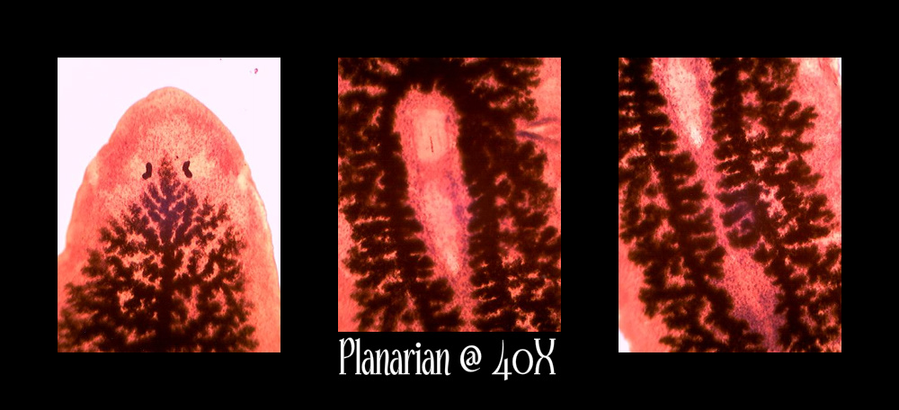A Planarian is an example of an organism from phylum Platyhelmintes. We used the images below to sketch an identify the structures. Use the diagram in Figure 11.9, located on page 350 in your textbook, to help you identify the eyespots, branched intestines, pharynx, and mouth.